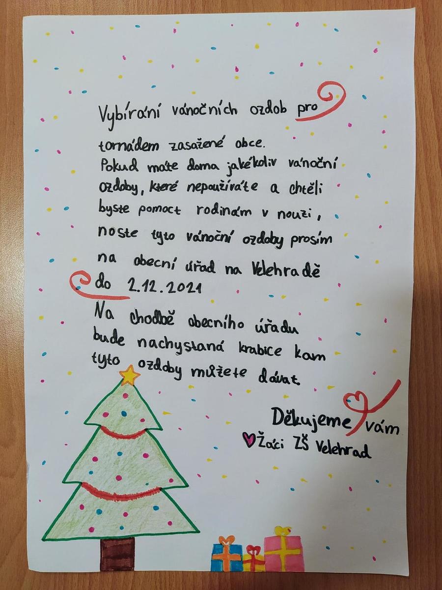 Jsme rádi, že jsme se jako škola mohli zapojit do pomoci obcím zasaženým tornádem. Mnoha rodinám vzalo tornádo střechu nad hlavou nebo zničilo do velké míry jejich domovy. Aby mohli mít i letos hezké Vánoce, chceme i my poslat prostřednictvím skupiny dobrovolníků a nadšenců trochu radosti. Vyrábíme vánoční přání určená do šesti tisíc rodin a sbíráme vánoční ozdoby, které rozzáří vánoční stromečky zejména v rodinách s malými dětmi. Předání proběhne na mikulášské nadílce 9. 12. 2021 v obci Hrušky. A protože jsme škola komunitní, oslovili jsme s prosbou o zapojení taky Stojanovo gymnázium, farnost a obce Velehrad, Modrou a Salaš. Všichni, kteří se chtějí zapojit a nadělit radost prostřednictvím originálního vánočního přání nebo vánočními ozdobami, mohou je přinést na určená místa do 2. 12. 2021. Děkujeme! ♥