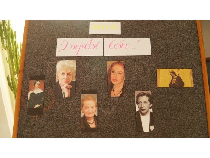 Žáci šesté třídy si pro své spolužáky, učitele i pro Vás, rodičovskou veřejnost, připravili anketu "O největší Češku." Vybrali 6 osobností, žen, které se významným způsobem zapsaly do české historie, kultury či politiky.